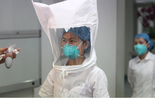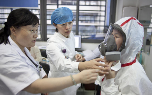 為應(yīng)對(duì)埃博拉,深圳醫(yī)護(hù)人員接受頭套密閉性測(cè)試