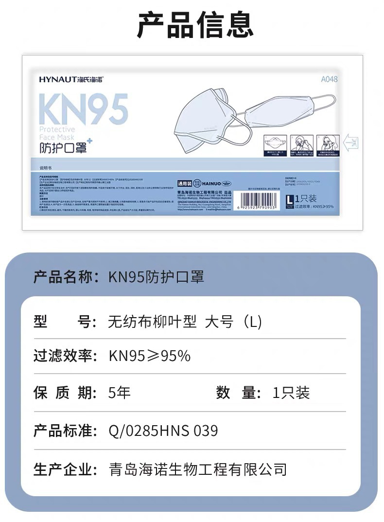 產(chǎn)品名稱:海氏海諾 A048 KN95 一次性防護(hù)口罩耳戴式四層獨(dú)立包裝無紡布柳葉大號)-白色/黑色